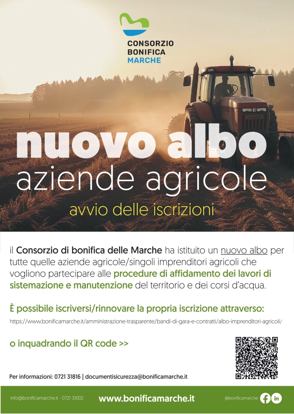 Si comunica ai Soci tutti che il Consorzio di bonifica delle Marche ha istituito un nuovo albo per aziende agricole e singoli imprenditori agricoli che vogliono affidare i lavori di sistemazione e manutenzione del territorio e corsi d’acqua.